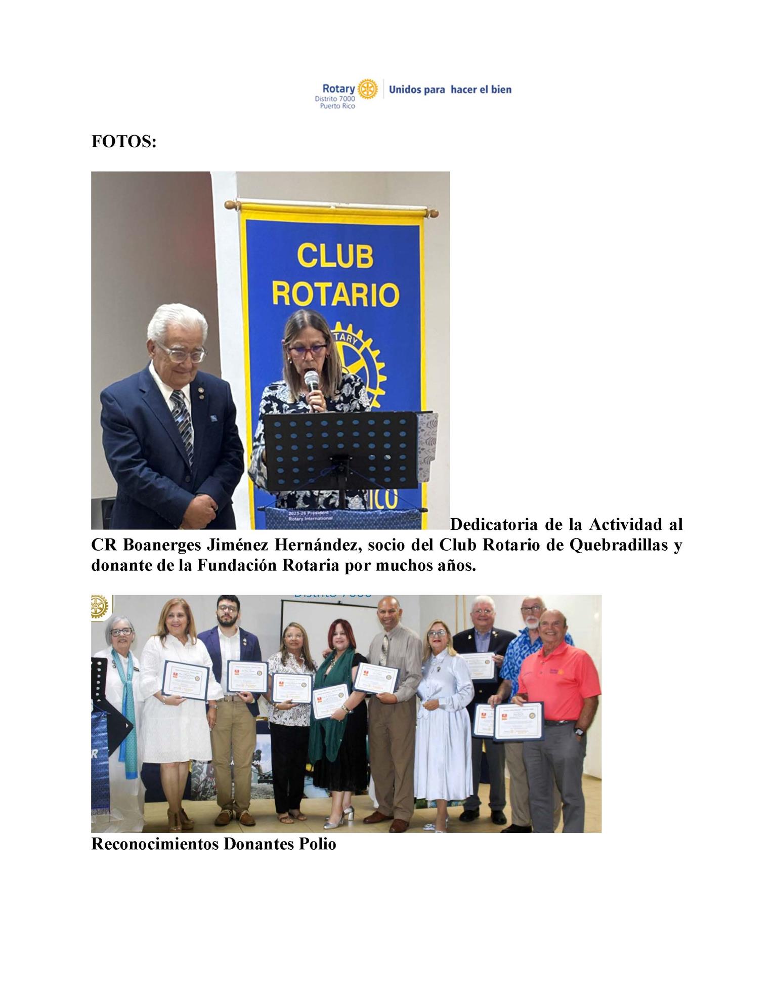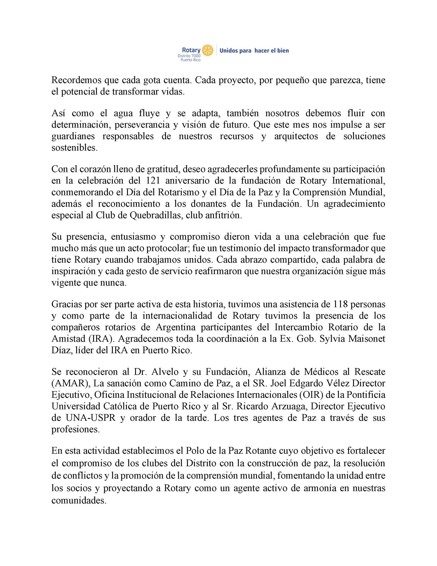 Como Gobernadora del Distrito 7000, quiero expresar mis más sinceras condolencias a su esposa Lilliam, sus hijos, su familia y a los compañeros del Club Rotario de Guayama por tan sensible pérdida. Honraremos su memoria continuando el trabajo que él impulsó con pasión y dedicación.
